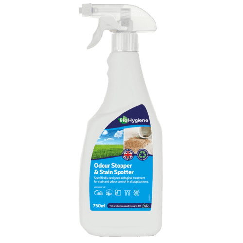 BioHygiene Odour Stopper and Stain Spotter provides quick and effective removal of odours and organic stains. Specialist biotechnology binds, absorbs and degrades odour molecules and organic matter to clean deeply and prevent smells from spreading. The dual-action formula is made from naturally-derived ingredients and is suitable for all types of surfaces and colourfast fabrics, leaving behind a clean and fresh fragrance.