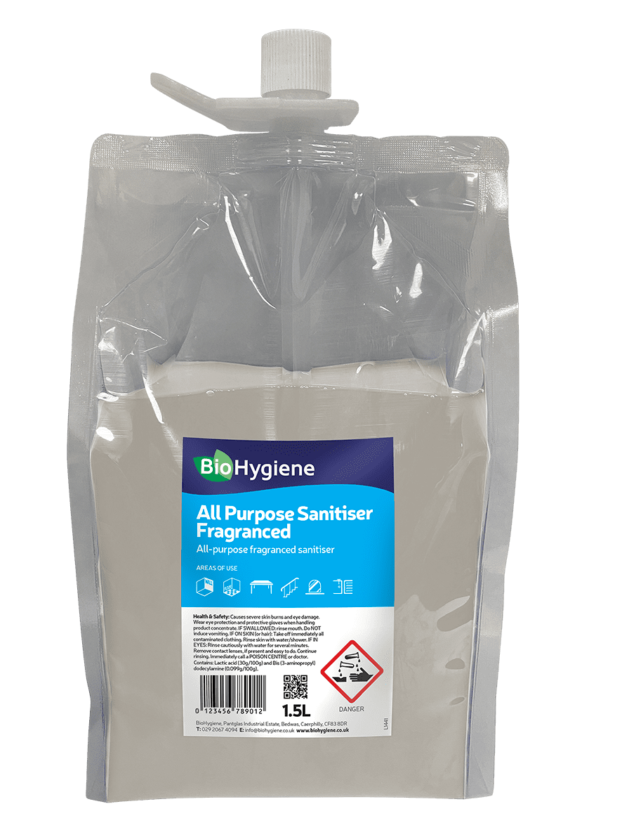 Our bestselling BioHygiene All Purpose Sanitiser is the safe way to prevent the spread of bacteria and viruses, including all types of Coronavirus. Specialist biotechnology provides the ultimate quad action clean that disinfects, deodourises, descales and deep cleans all types of surfaces throughout your workplace.