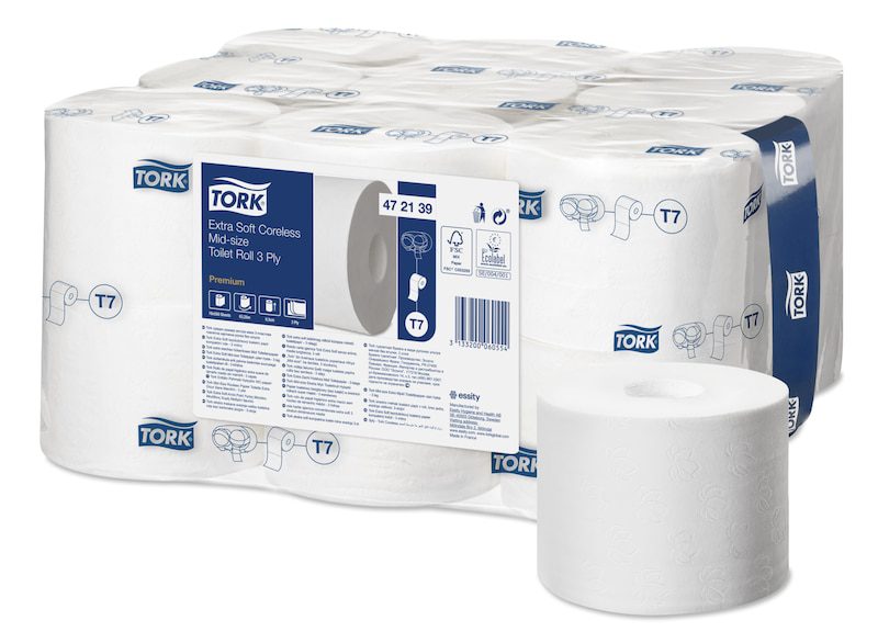 The Tork Twin Coreless Mid-size Toilet Roll Dispenser system is ideal for low to medium traffic washrooms with a high focus on guest satisfaction. It ensures high efficiency and that toilet paper is always available for guests by holding two full mid-size rolls. The Premium Tork Extra Soft Coreless Mid-size Toilet Roll offers a superior look and feel with the right performance.