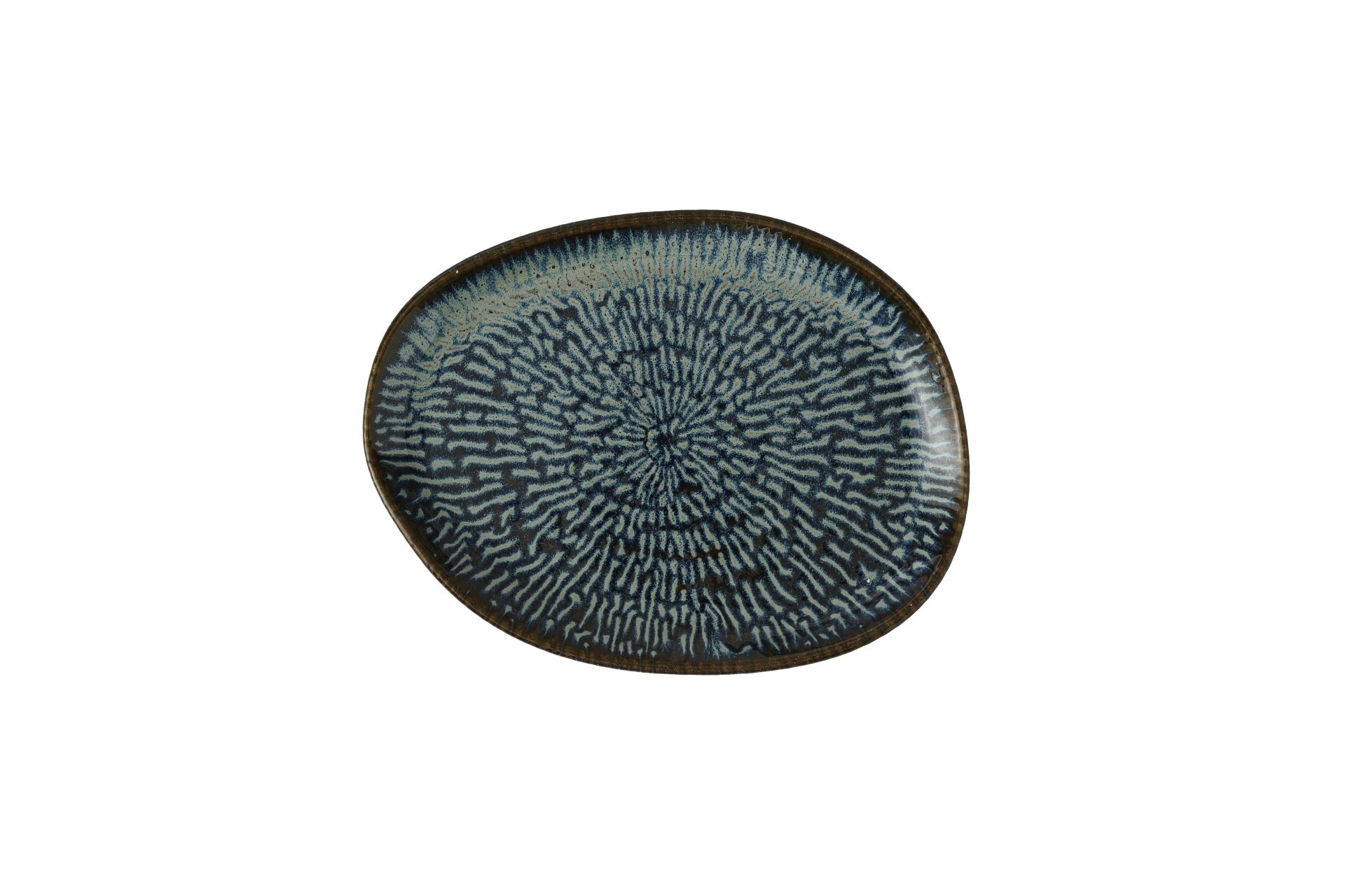 A capitivating pattern of cascading lines, radiating from a central point and framing food presentation. The Sapphire Blue reactive glaze, applied front and back to soft organic shapes, the multi tonal glaze means that each piece is unique.