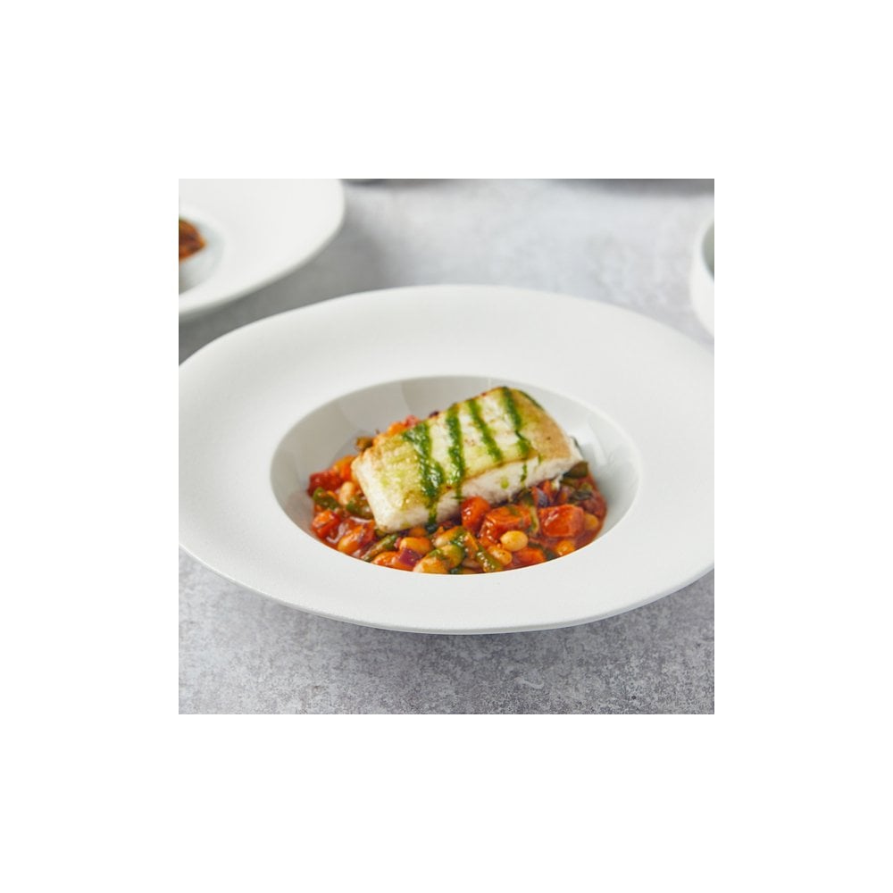 The Incise Porcelain Lustre collection features an elegant series of gourmet dishes, finished with a refined textured matt white glaze for added sophistication. The centre of each plate showcases a stunning reactive pearlescent glaze, creating a captivating focal point. Perfect for upscale settings, this range blends striking aesthetics with practical design, allowing chefs to create visually stunning and memorable presentations for any occasion.