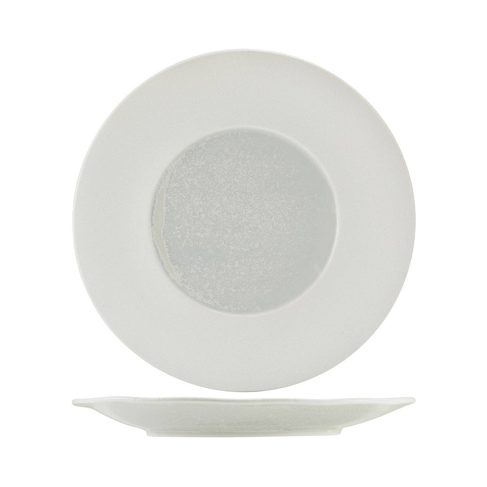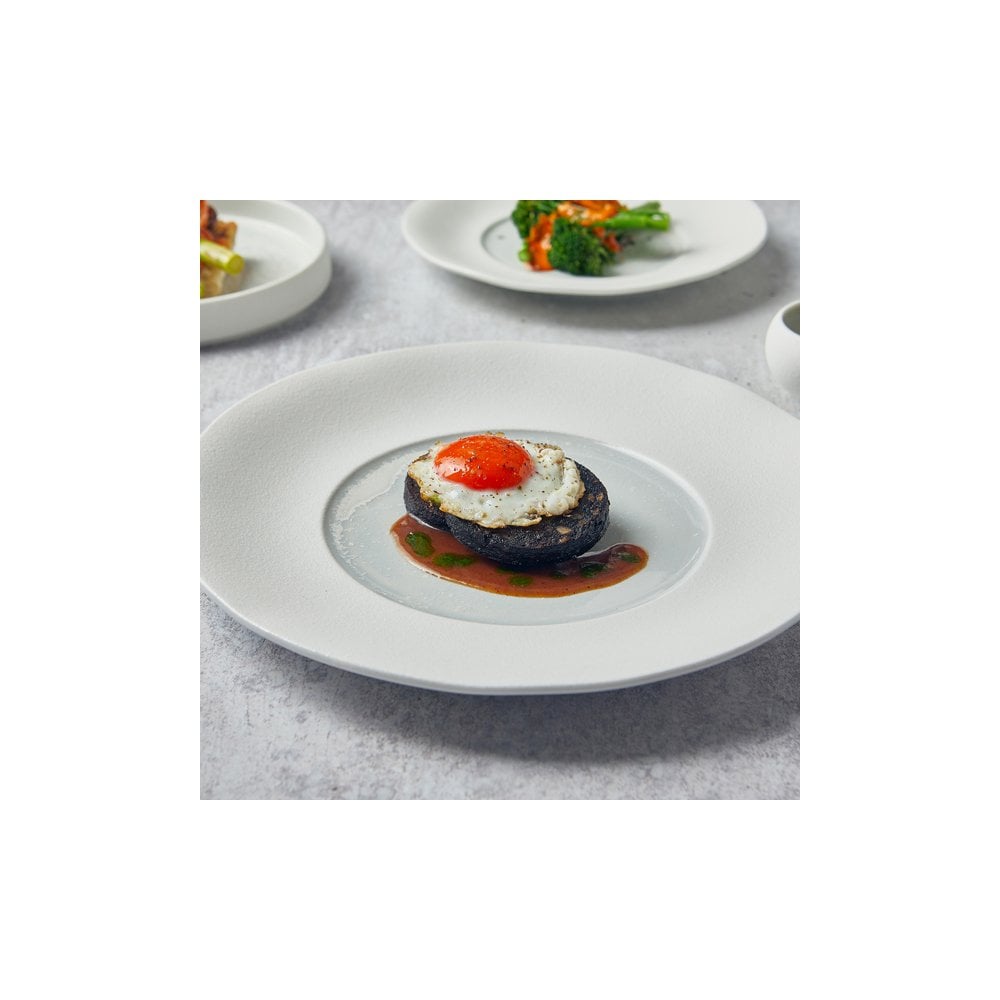 The Incise Porcelain Lustre collection features an elegant series of gourmet dishes, finished with a refined textured matt white glaze for added sophistication. The centre of each plate showcases a stunning reactive pearlescent glaze, creating a captivating focal point. Perfect for upscale settings, this range blends striking aesthetics with practical design, allowing chefs to create visually stunning and memorable presentations for any occasion.