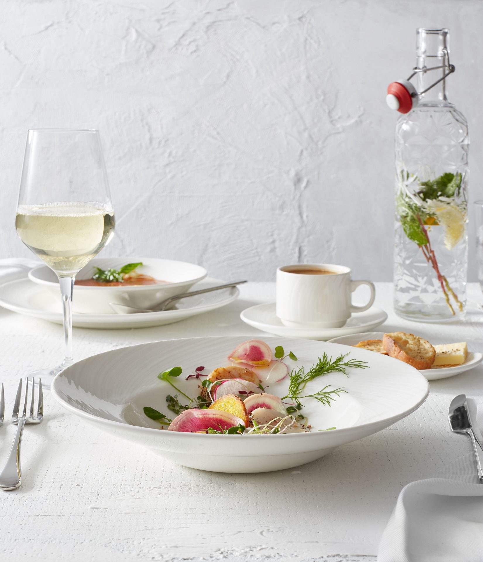 Spyro is a truly spectacular range that combines contemporary forms and traditional finishing. Each piece is individually styled with a delicate swirling embossment that catches the light to create a captivating optical effect of highlights and shadows. Spyro is perfectly at home in any environment, from banqueting to fine dining.