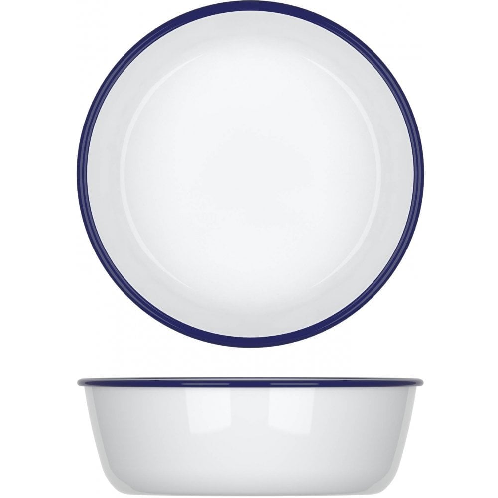 This large Athens bowl replicates all the benefits of using the classic white and blue retro enamel ware, but created by us in 100% pure melamine. The volume of this bowl is 1.8LUnlike traditional enamel where the blue rim will peel and chip off over time, visibly detracting from the appearance, our melamine Athens bowl is durable, long lasting and easy to maintain.